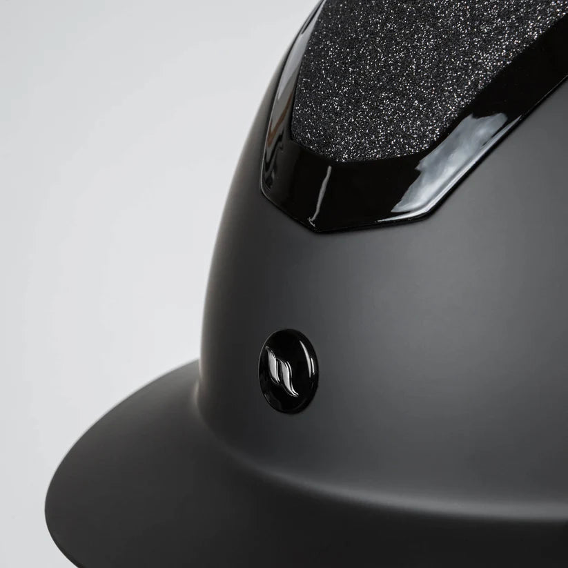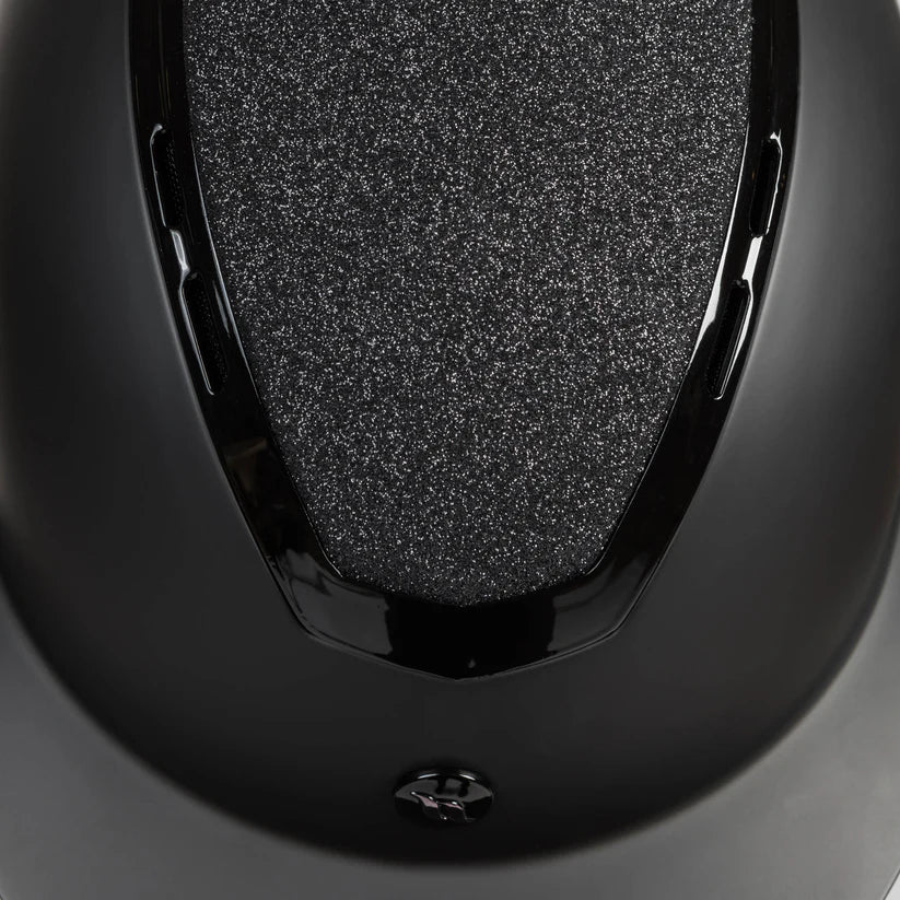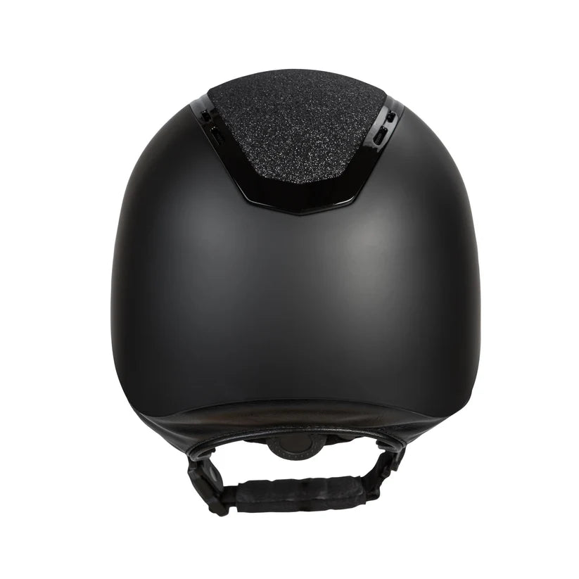 El casco Caracas de Back on Track es completamente negro con acabado mate, con la parte central cubierta de glitter negro y detalles brillantes combinando función, seguridad y estilo en un diseño elegante y moderno. Incluye un cierre magnético, que permite abrir y cerrar la hebilla con una sola mano, sin necesidad de quitarse los guantes.