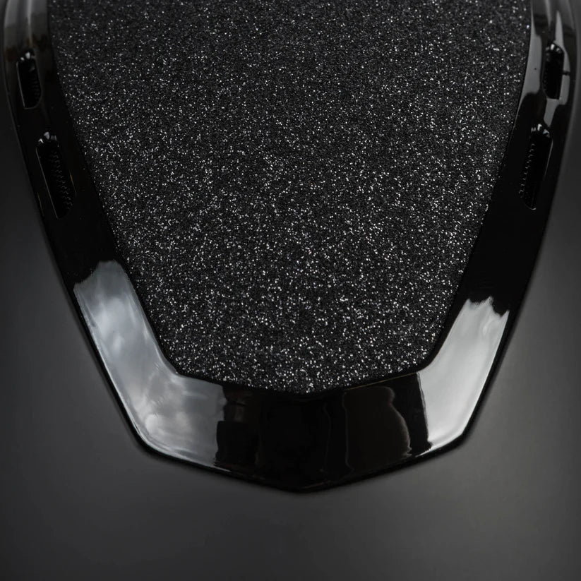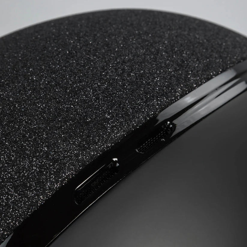 Este modelo se caracteriza por su glamour refinado y discreto, con la parte central cubierta de glitter negro y detalles brillantes. Una banda decorativa en negro brillante integra orificios de ventilación, combinando estética y funcionalidad.